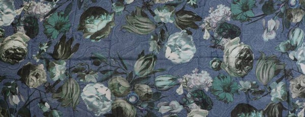 Highfield shawl van 100% Merino wol met dessin “Flower”, kleur On Blue size 70cm x 180cm